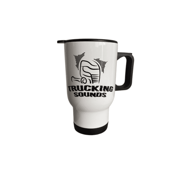 White & Black travel mug with Trucking Sounds logo front & back.